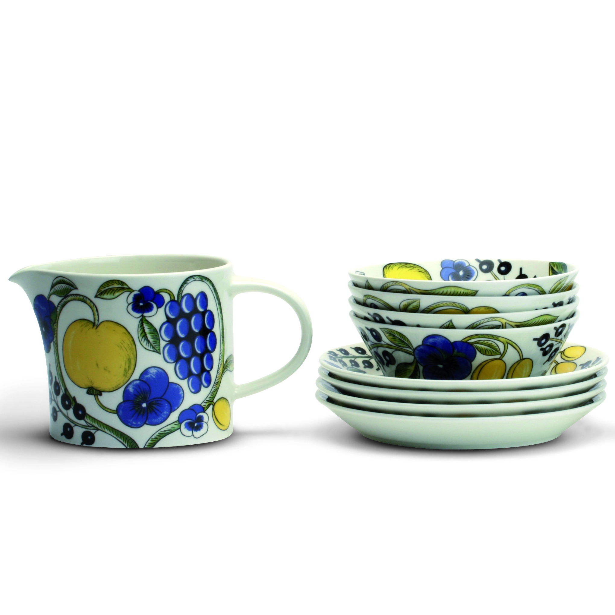 Esta bella jarra pertenece a la vajilla de porcelana Paratiisi de la conocida marca finlandesa Arabia. La jarra combina una forma sencilla con un bonito patrón en colores fuertes. La vajilla Paratiisi fue creada por el diseñador finlandés Birger Kaipianien y es todo un clásico muy querido de Arabia. Está disponible en dos tamaños, ideales para servir leche a la hora del café o agua y bebidas refrescantes. ¡Combina esta decorativa jarra con el resto de finas piezas que forman la vajilla Paratiisi de Arabia!